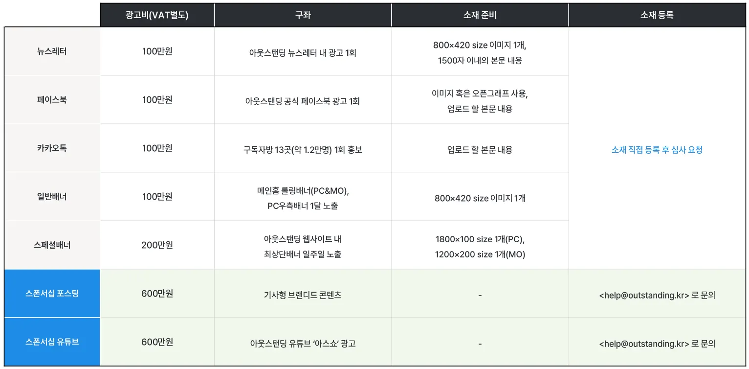 보다 자세한 문의는 <help@outstanding.kr>로 요청 부탁드립니다.